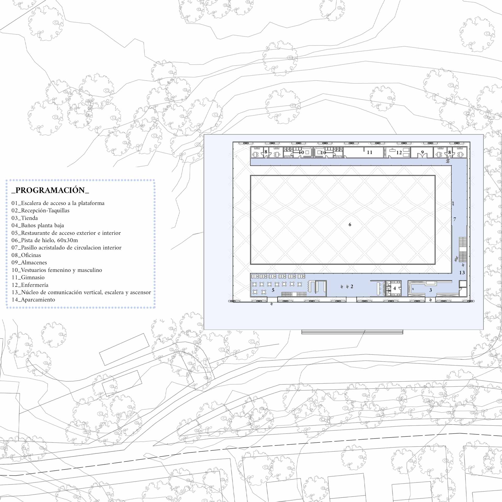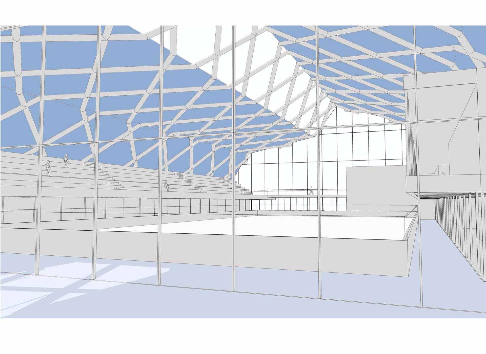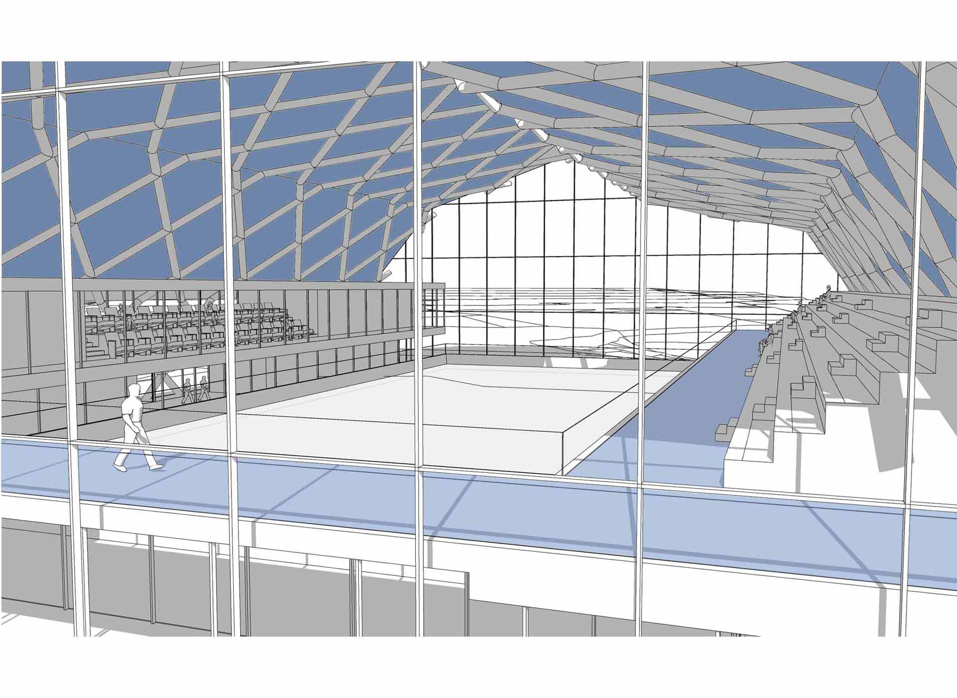 Este caparazón albergará un Centro Deportivo de Patinaje sobre hielo, con las medidas estipuladas para el patinaje olímpico, además de vestuarios, cafetería, salas de máquinas y todo aquel equipamiento necesario para ser funcional.