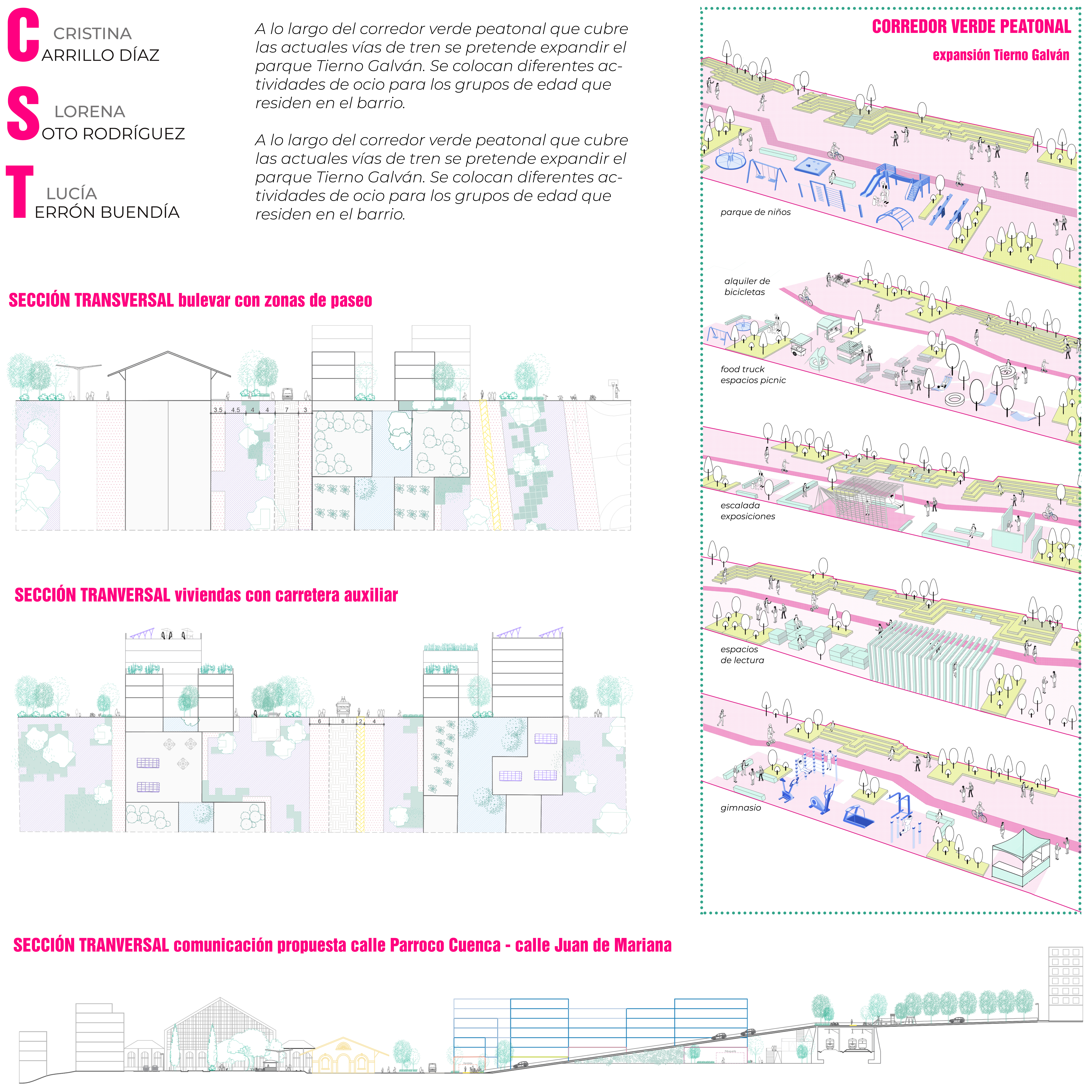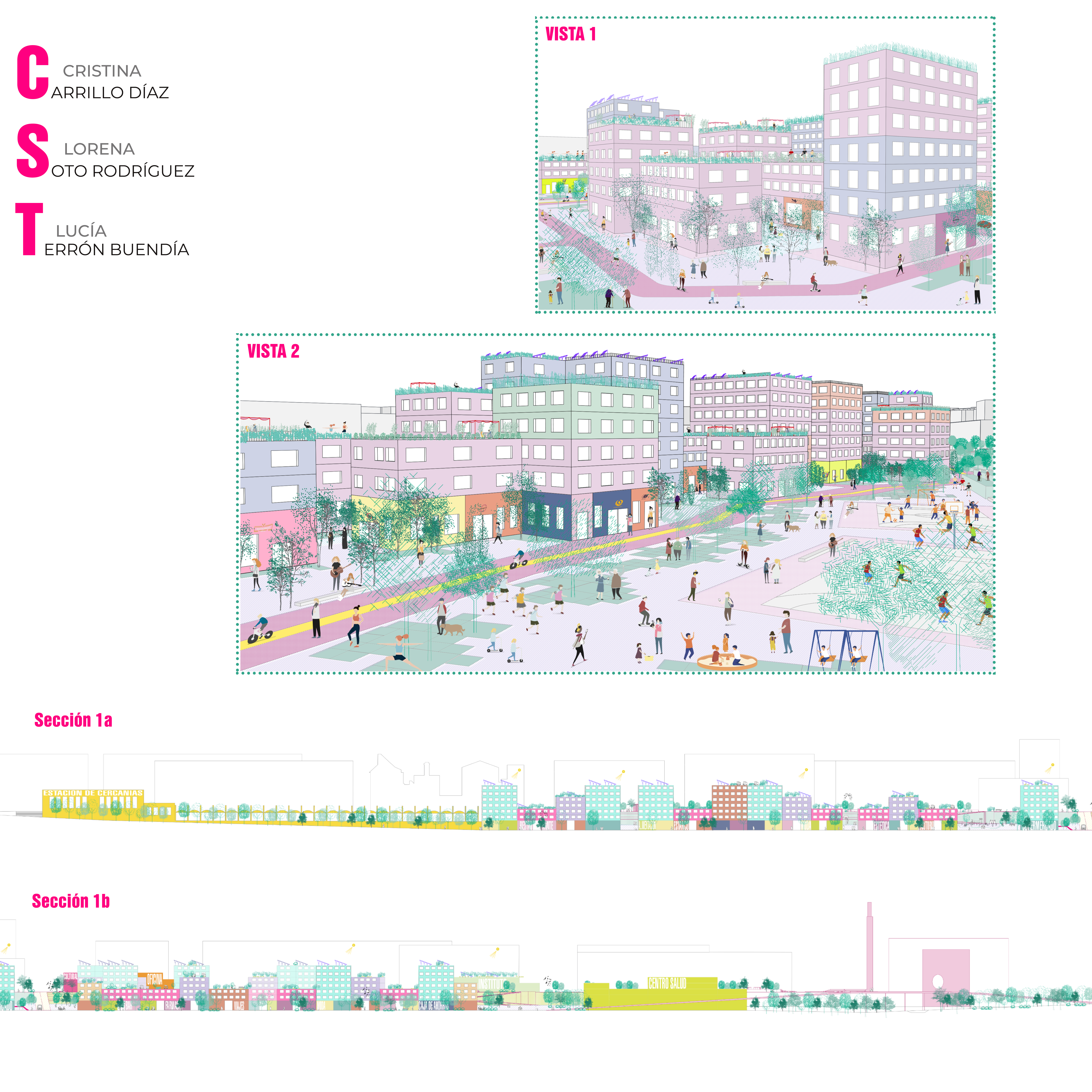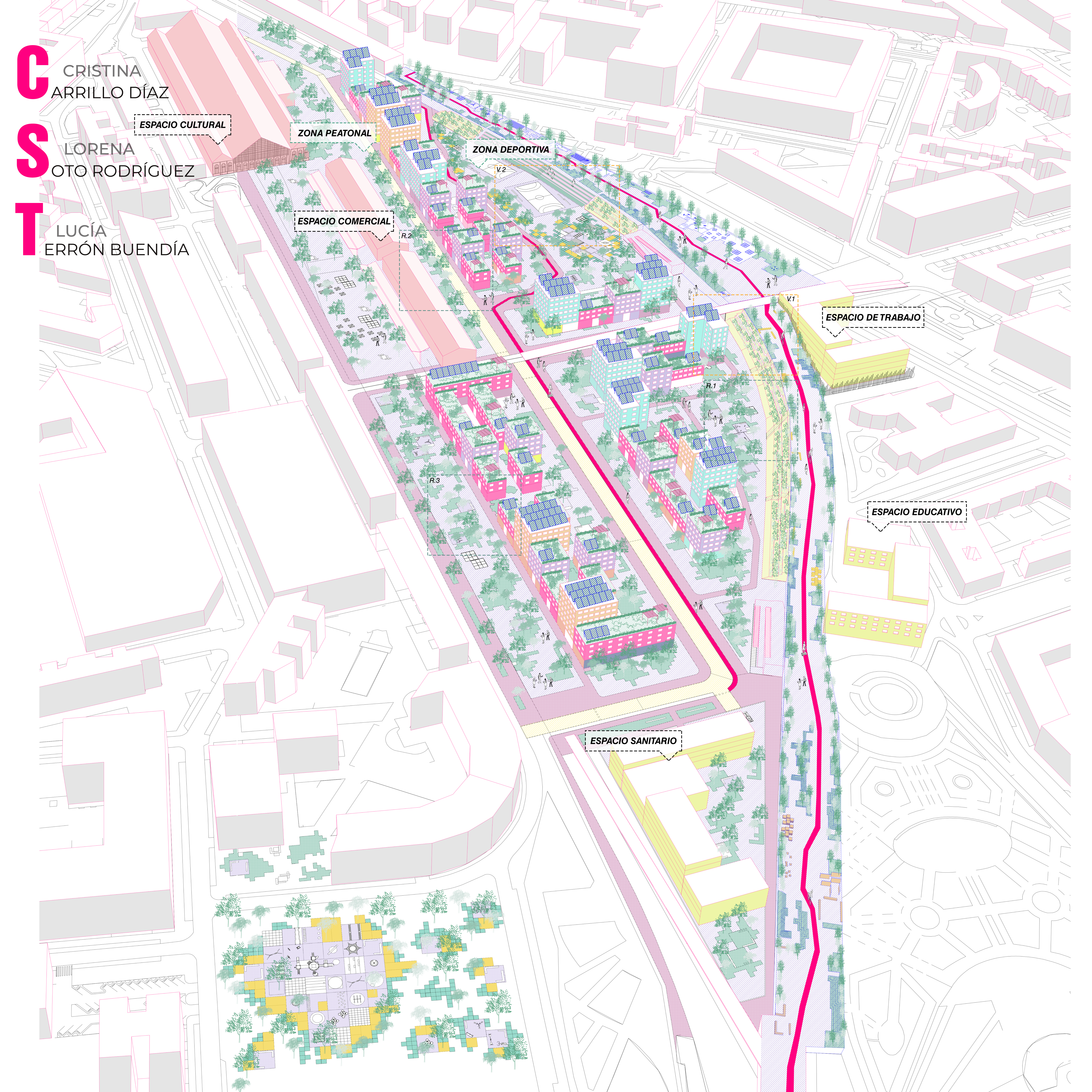 Se equipa el barrio con doctación, como un colegio, un centro de salud y un gran edificio de oficinas. Además de cubrir las vias, con un gran corredor verde que hace de pieza de remate final con el parque Tierno Galván, teniendo accesos con ambos lados y facilitando la movilidad y su recorrido, cuenta con un carril bici y diferentes espacios de activiades culturales y sociales.