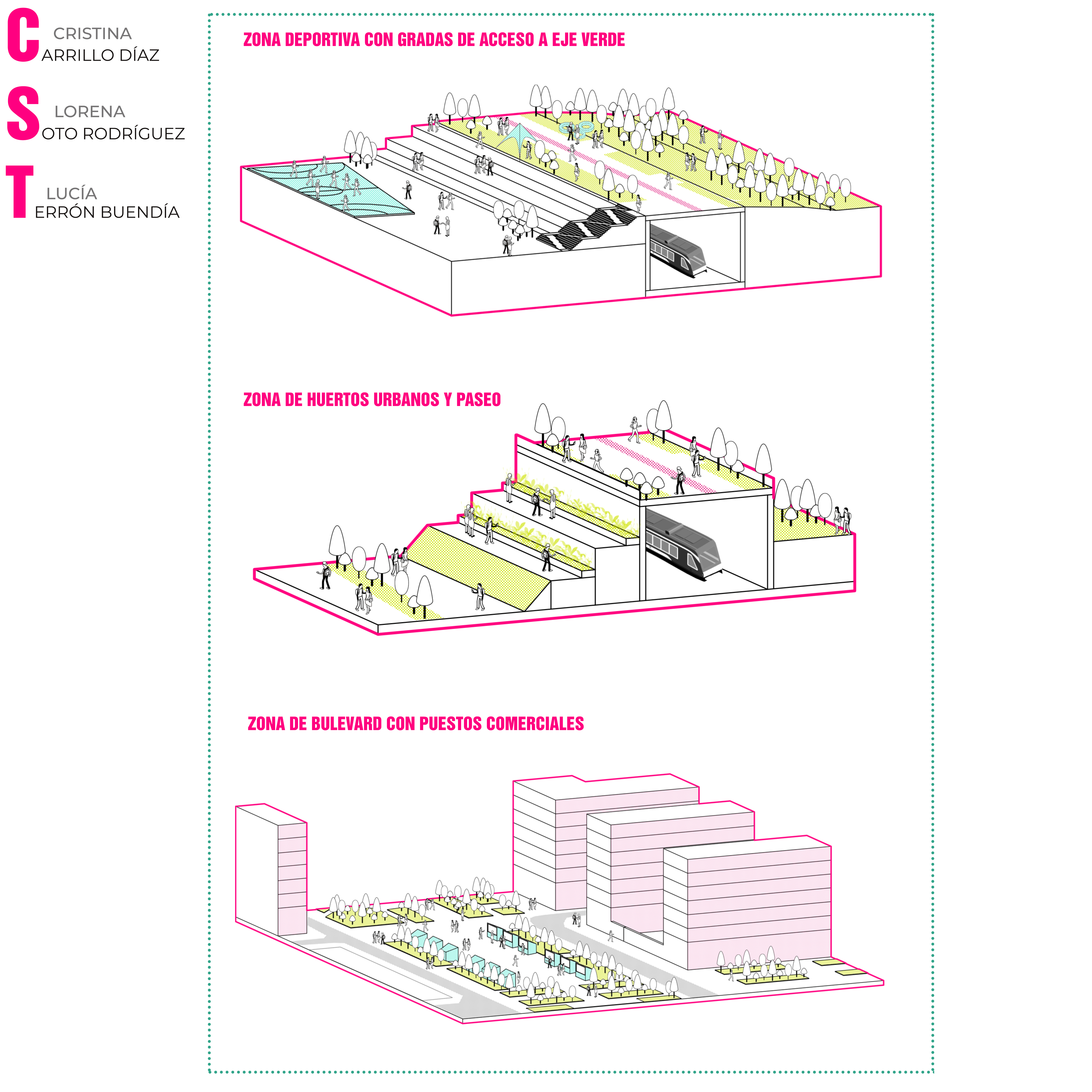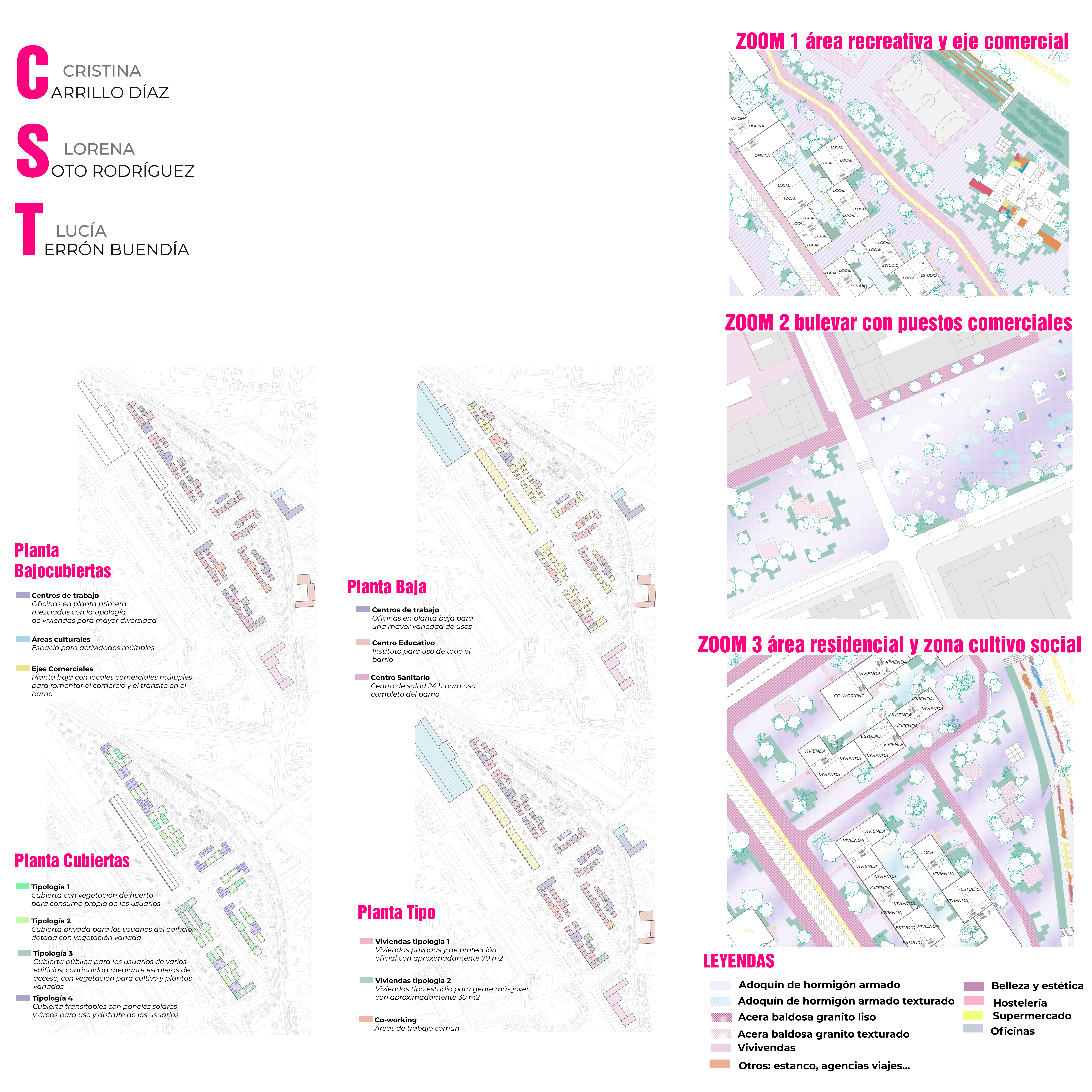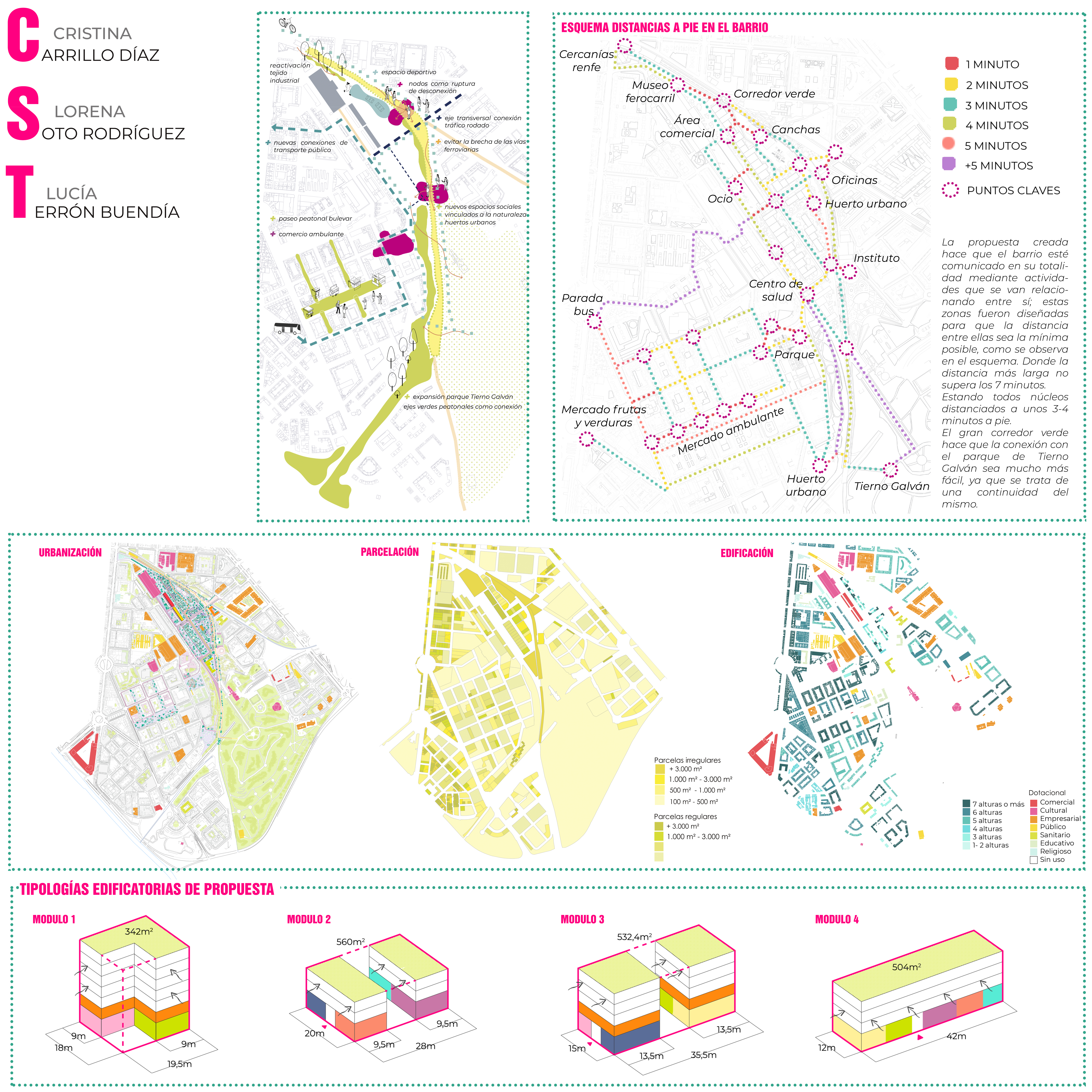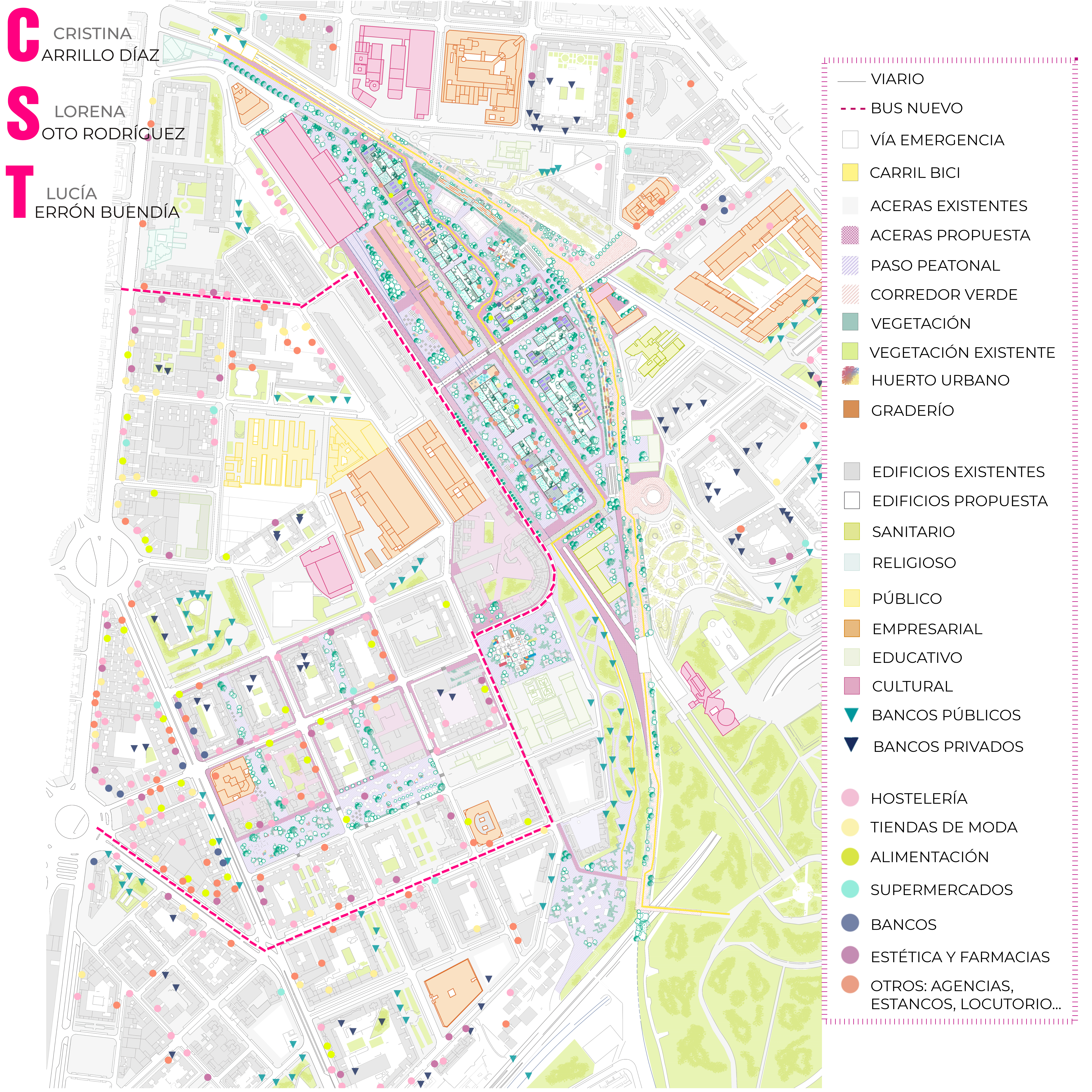 Se equipa el barrio con doctación, como un colegio, un centro de salud y un gran edificio de oficinas. Además de cubrir las vias, con un gran corredor verde que hace de pieza de remate final con el parque Tierno Galván, teniendo accesos con ambos lados y facilitando la movilidad y su recorrido, cuenta con un carril bici y diferentes espacios de activiades culturales y sociales.